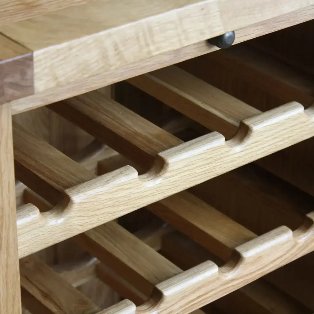 Vínna skrinka z masívu držiak na víno na celkom 20 fliaš v rámci 5 poličiek na 4 fľaše. Vo vrchnej časti skrinky na víno sa navyše nachádza výsuvná polička ako prípadné rozšírenie vrchnej odkladacej časti, čo prakticky poslúži na umiestnenie pohárov hlavne pri väčšej skupine ľudí. Do spodnej zásuvky je zase možné odložiť otvárač na fľaše a iný doplnkový sortiment na víno.