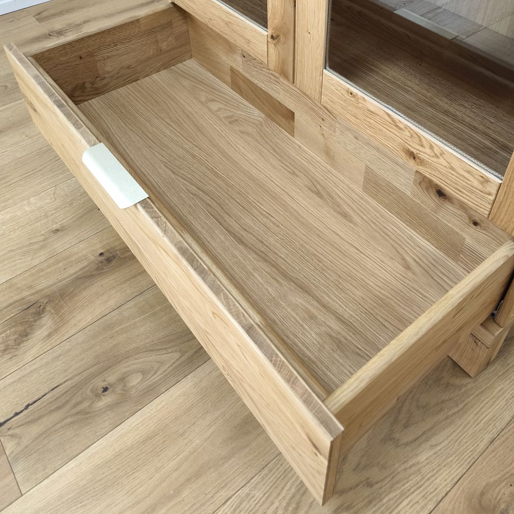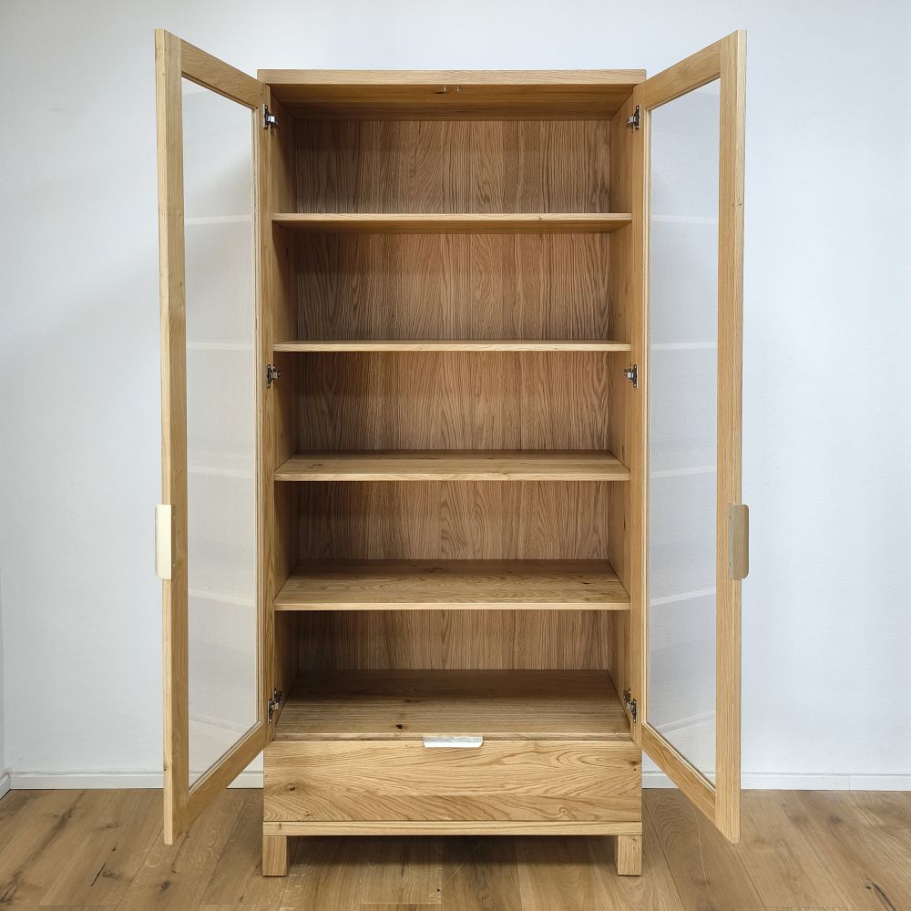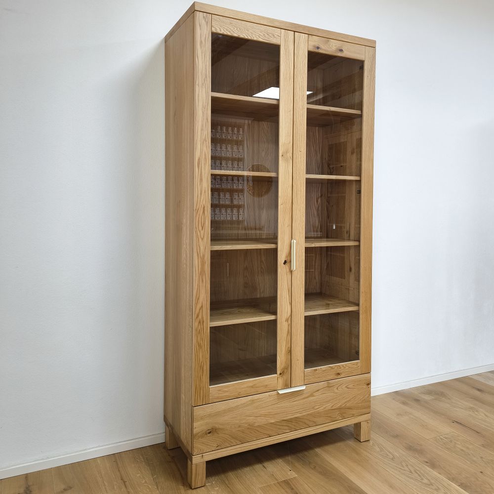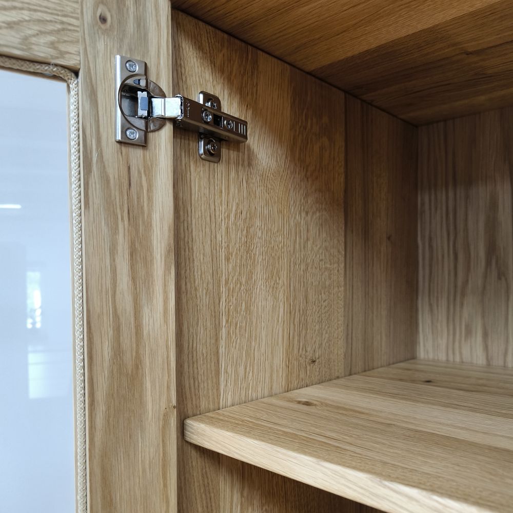Masívna drevená vitrína predstavuje spojenie nadčasového dizajnu a precíznej remeselnej výroby. Sklenené dvierka pôsobia vzdušne a umožňujú krásne vystaviť poháre, dekorácie či zbierkové predmety. Dubový masív v prírodnom odtieni dodáva nábytku výnimočnú pevnosť, dlhú životnosť a prirodzenú kresbu, ktorá obohatí každý interiér – od modernej obývačky až po rustikálne ladenú domácnosť.