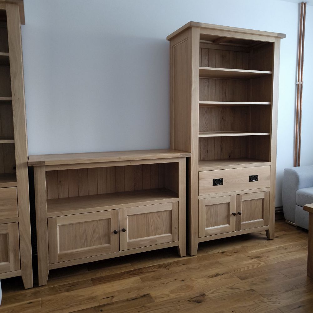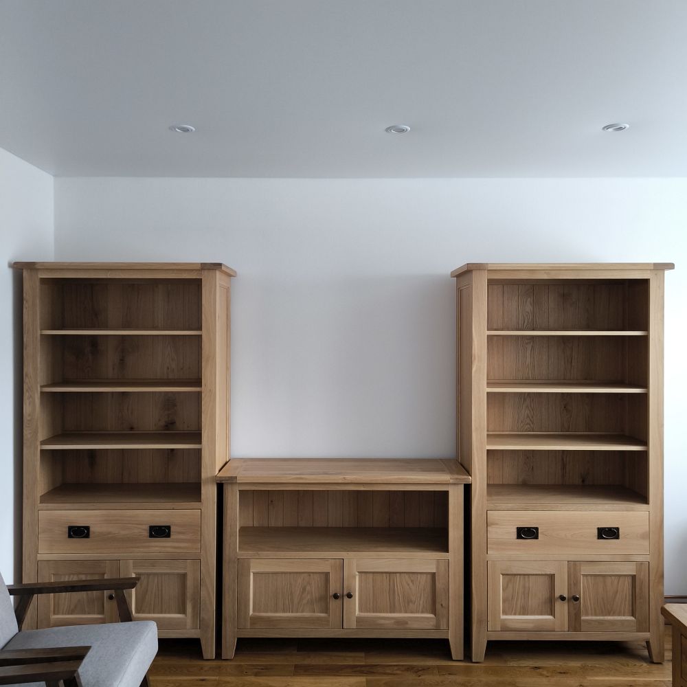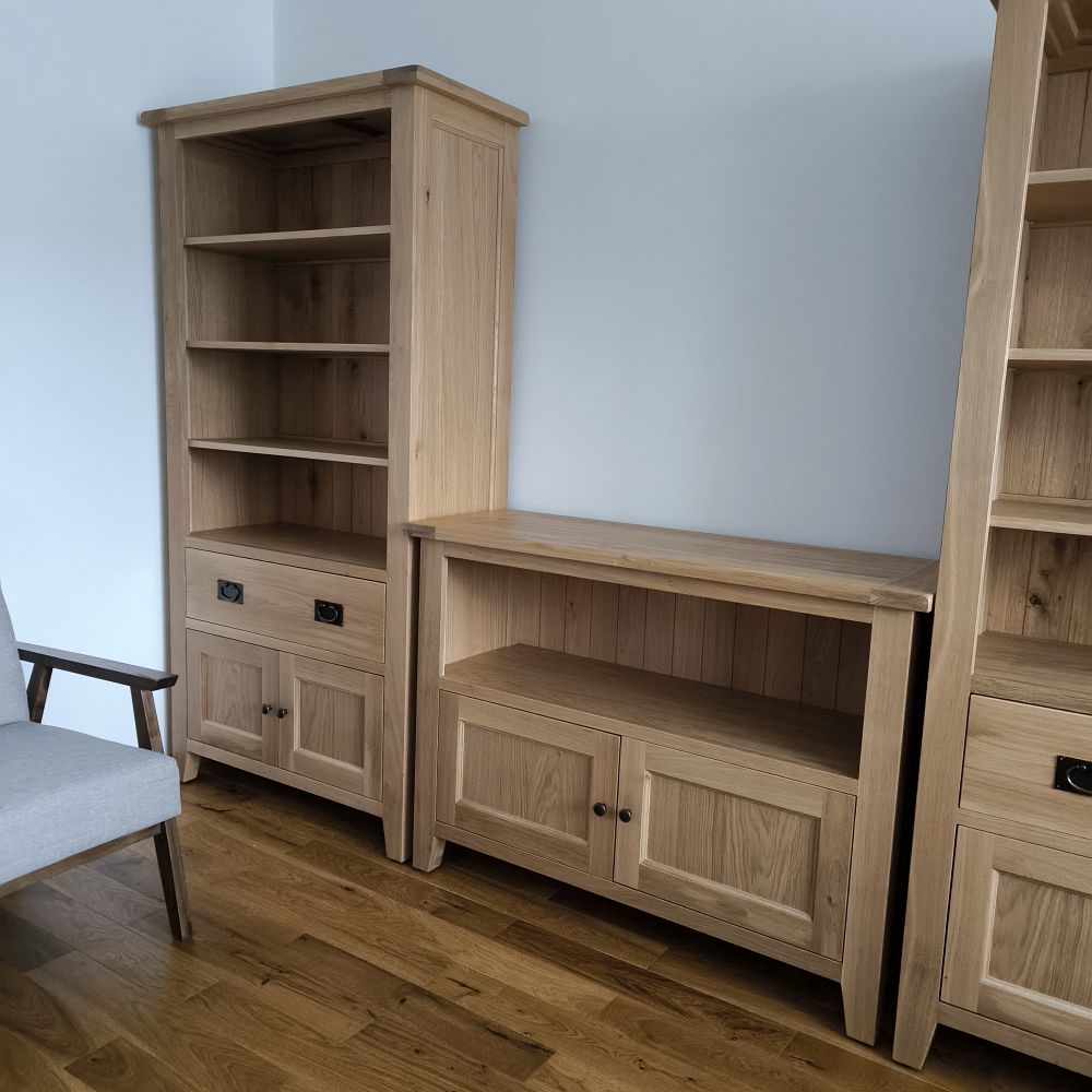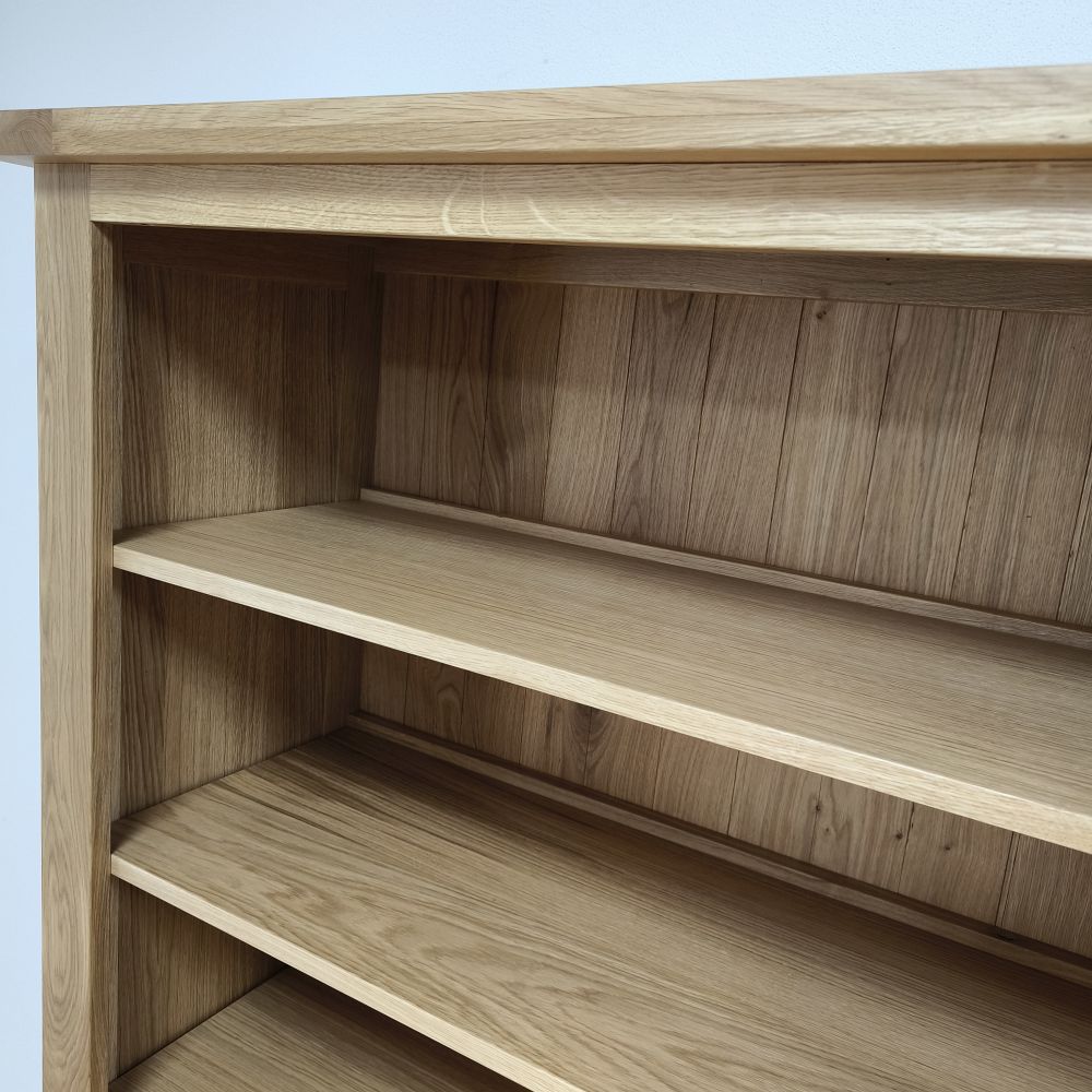 Masívna drevená knižnica predstavuje elegantné a zároveň praktické riešenie pre každého milovníka dreva a tradičného dizajnu. Vysoká knižnica z masívu sa vyznačuje kvalitným spracovaním a pevnou konštrukciou, ktorá je ideálna nielen do obývačky, ale aj do pracovne, jedálne či klasického interiéru. Vďaka svojej úzkej hĺbke pôsobí odľahčene, no v skutočnosti je to veľmi stabilný kus nábytku, pripravený uniesť aj ťažšie predmety. Telo knižnice je vyrobené z dubového dreva, ktoré je známe svojou tvrdosťou, dlhou životnosťou a prirodzenou krásou. Dubová knižnica má tri pevné masívne police, pričom medzi nimi je rovnomerný priestor s výškou 25 cm – ideálny pre uloženie kníh rôznych formátov. Knižnica na knihy tak poskytuje priestor aj na dekorácie, rámiky s fotografiami či menšie izbové rastliny. Zadná stena je vyplnená dôkladne osadenou dubovou palubovkou, ktorá dotvára robustný a elegantný vzhľad. Tento detail zároveň zabezpečuje vyššiu pevnosť celej konštrukcie. Masívne nožičky dodávajú knižnici vzdušnosť a zároveň uľahčujú upratovanie pod ňou.