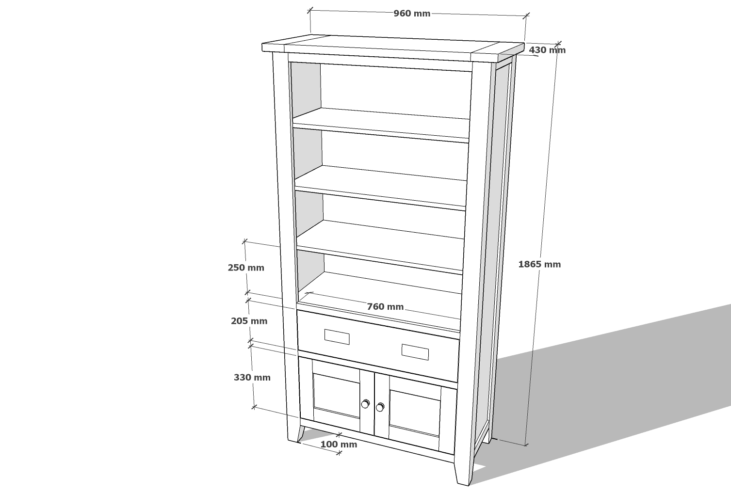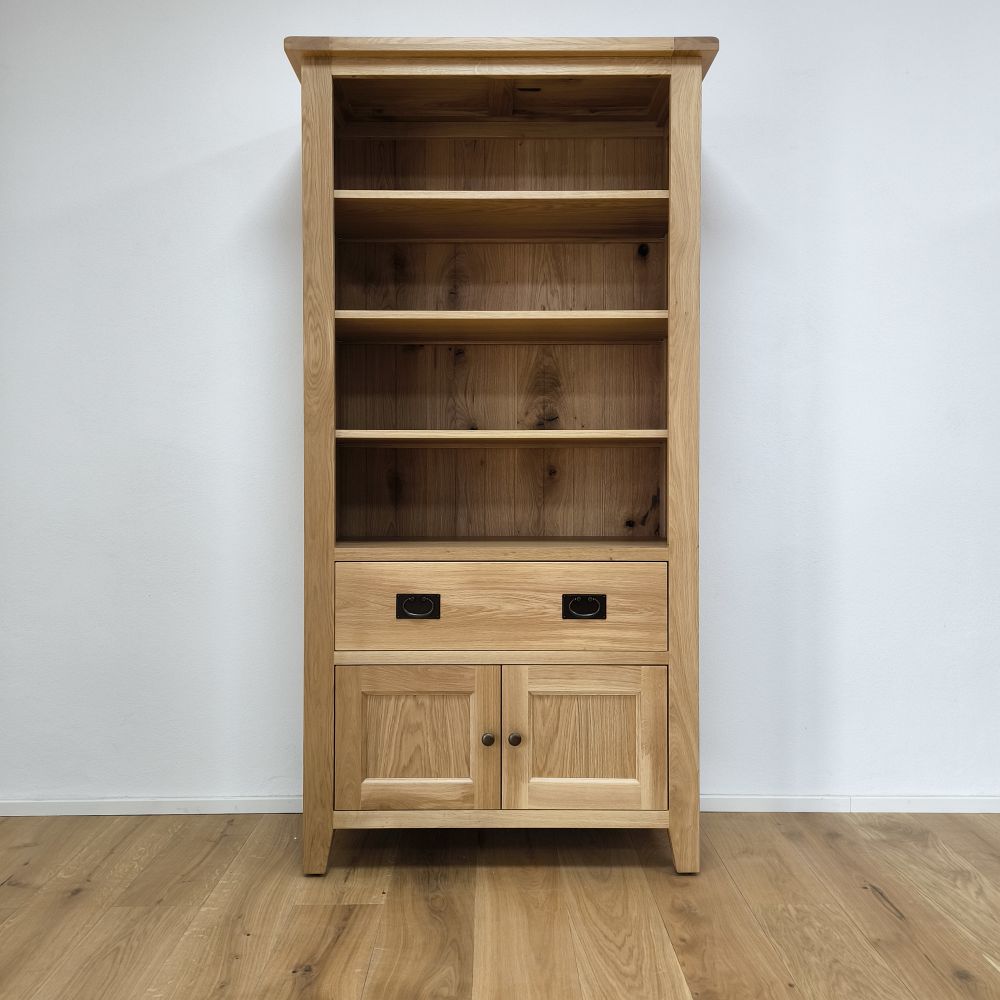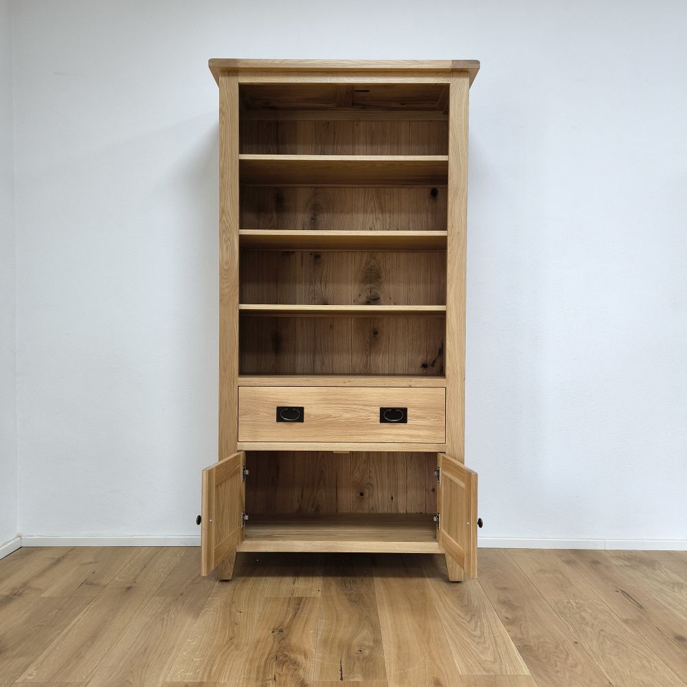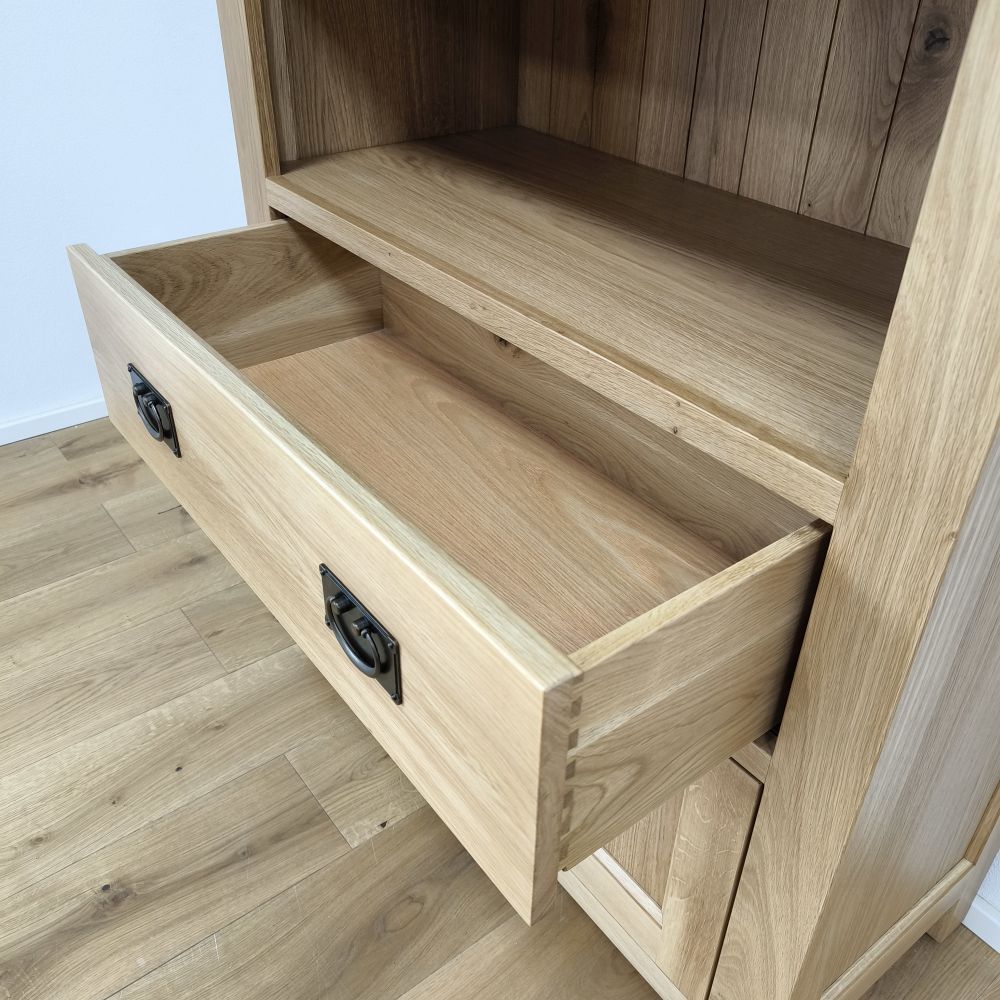 Pod tromi hlavnými policami sa nachádza praktická zásuvka vybavená mosadznými úchytkami. Odkladací priestor zásuvky je ideálny na uloženie drobností, ktoré chcete mať vždy poruke, no zároveň ukryté pred zrakom. Zásuvka je pevná, na kovových pojazdoch, takže vydrží aj častejšie používanie. V spodnej časti sa nachádzajú dvierka, za ktorými sa skrýva ďalší objemný úložný priestor. Výška tejto uzatvorenej časti plne postačuje na uloženie šanónov, albumov či väčších dokumentov. Vďaka tomu sa knižnica stáva nielen estetickým, ale aj praktickým kusom nábytku. Knižnica je ošetrená tvrdým voskovým olejom, ktorý zvýrazňuje textúru dubového dreva a zároveň chráni povrch pred nečistotami a vlhkosťou. Povrch zostáva matný, príjemný na dotyk a zachováva prirodzený vzhľad masívneho dreva.