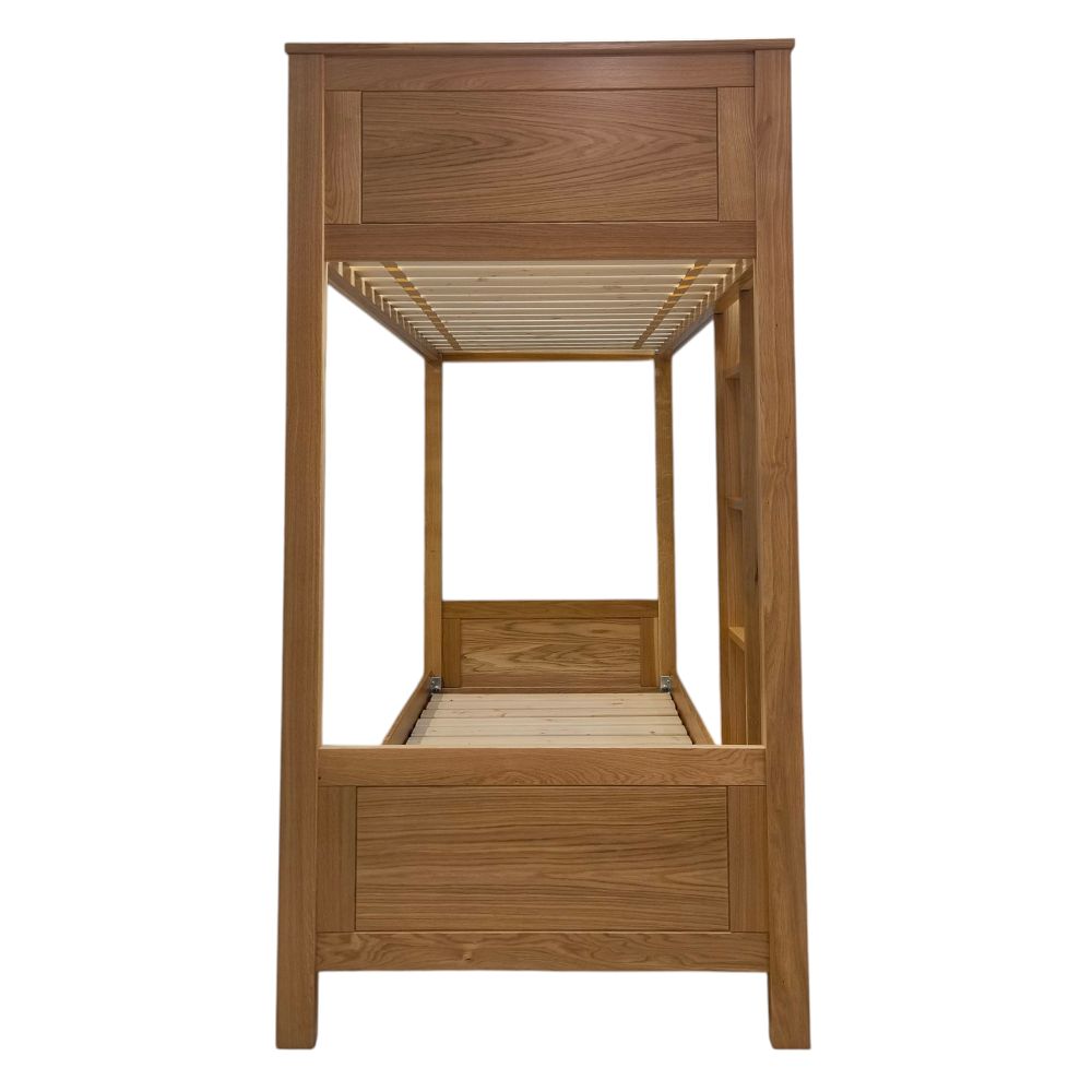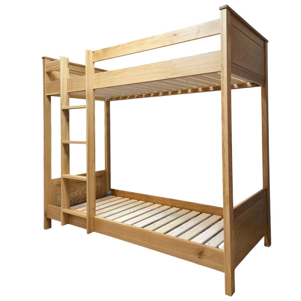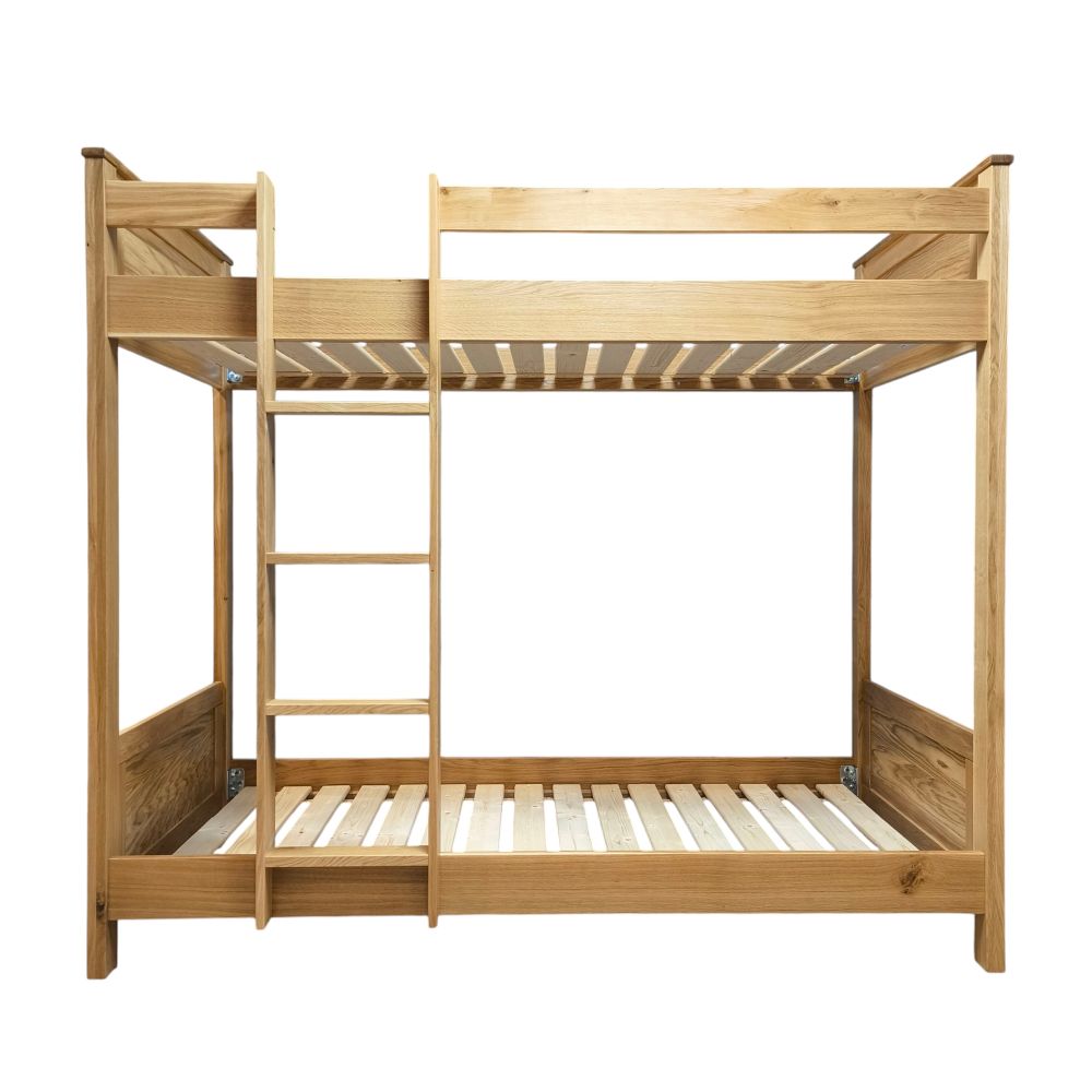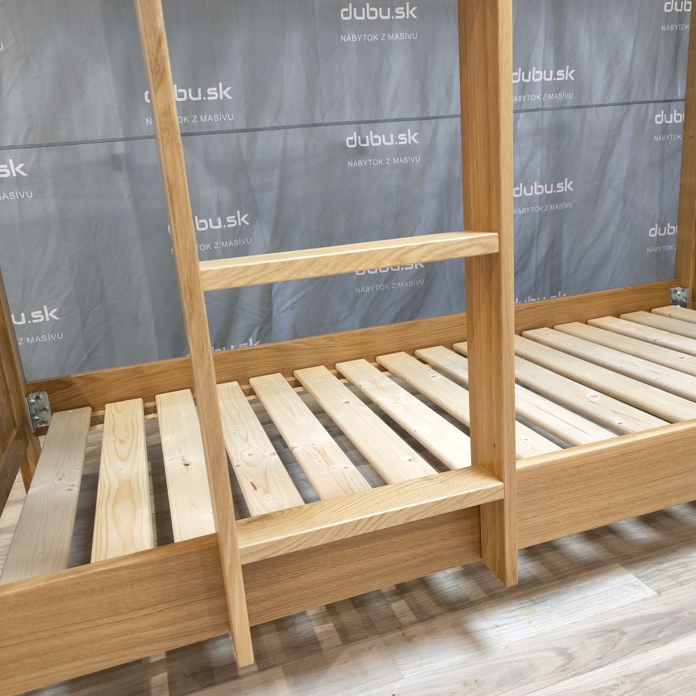 Poschodová posteľ z masívneho dubu je vhodná pre matrace 90 × 200 cm, dostupná s montážou rebríka zľava alebo sprava. Kvalitné spracovanie poschodovej posteli z dreva zaručuje dlhú životnosť a nadčasový vzhľad. Výborné riešenie pre tých, ktorí hľadajú masívne drevené postele s dôrazom na bezpečie, praktickosť a prirodzenú krásu dreva.
