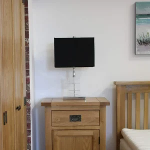 Úzka dubová TV skrinka s 2 poličkami a zásuvkou, 140x43x54 cm