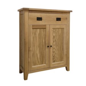 Biela komoda z masívu má na vrchnej časti osadenú dubovú platňu ošetrenú prírodným olejom, ktorý zvýrazňuje prirodzenú štruktúru dubového vlákna. Telo komody vrátane vnútornej časti ako aj chrbát komody je nastriekaný bielou kriedovou farbou v jemne smotanovom nádychu. Biela farba komody a drevená časť vrchnej platne spolu harmonicky ladia do teplého spektra, čím romanticky spríjemnia okolie izby. Zásuvky bielej komody sú ozdobebné praktickými striebornými kovovými madlami v tvare mušle. Rovnako aj dvierka bielej drevenej komody sú inštalované na priznaných pántoch striebornej matnej farby.
