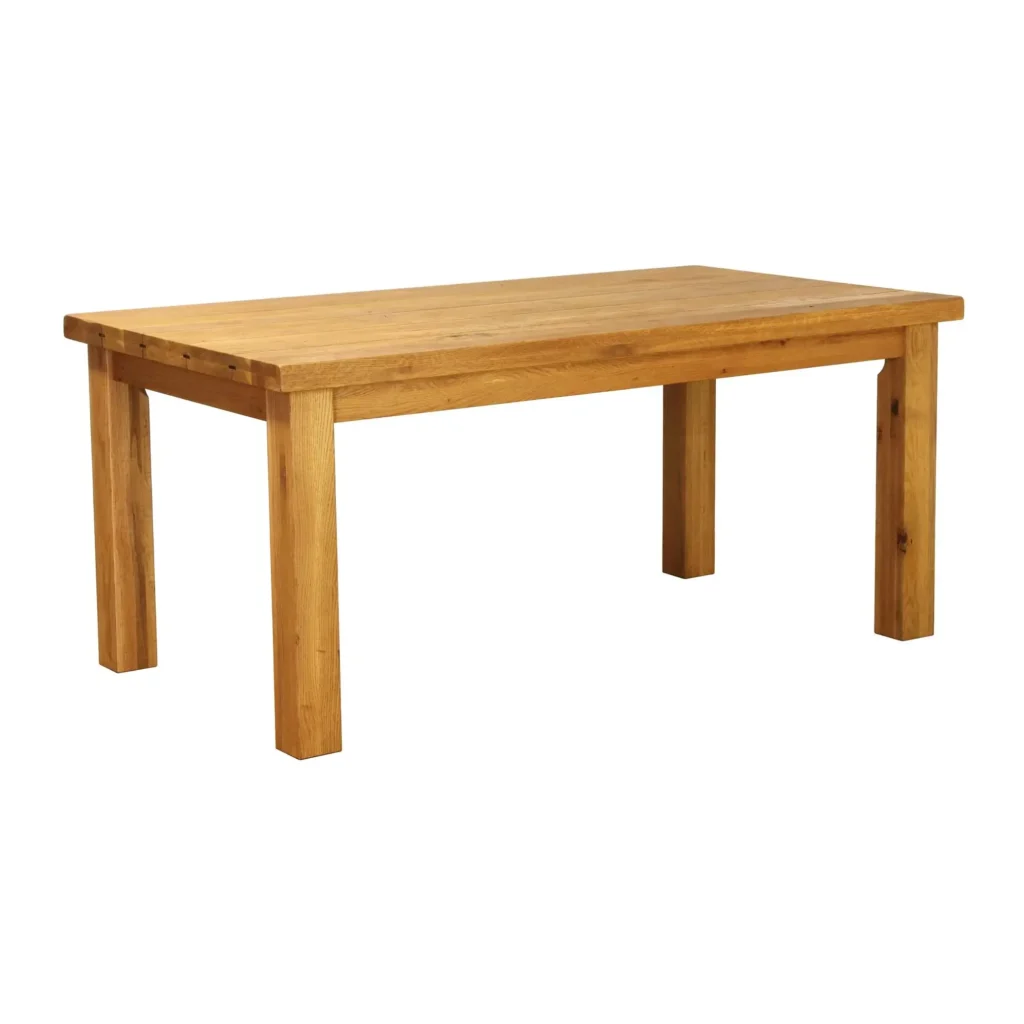 Vosková súčasť ochrany odpudzuje prachové častice a chráni priedušné póry dreva počas života v interiéry. Užšie strany platne sú spojené s okrasnými kovovými sponami, ktoré pridávajú na rustikálnosti jedálenského stola. Dubová platňa s malými priznanými sukmi bez tmelenia je mierne narezaná naprieč dĺžky stola a to nielen z estetického dôvodu, ale aby vyrovnávala prípadné pnutia a sily pôsobiace na drevo počas dilatačných sezón. Takto je stôl pripravený odolávať aj vykurovacej sezóne, či nadpriemerne teplému podlahovému kúreniu.